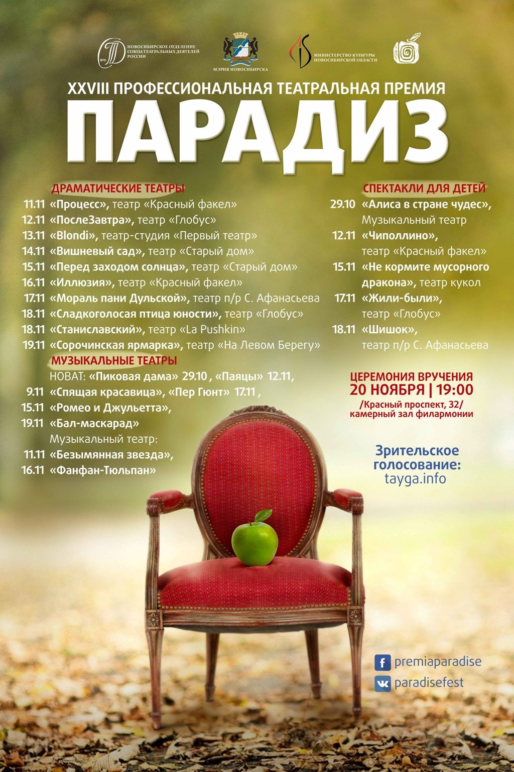 Драматические, кукольные и музыкальные спектакли Новосибирска поборются за профессиональную премию «Парадиз» в 18 номинациях. Фестивальные показы пройдут на городских сценах с 11 по 19 ноября, церемония вручения 28-й премии состоится 20 ноября в Камерном зале Филармонии.