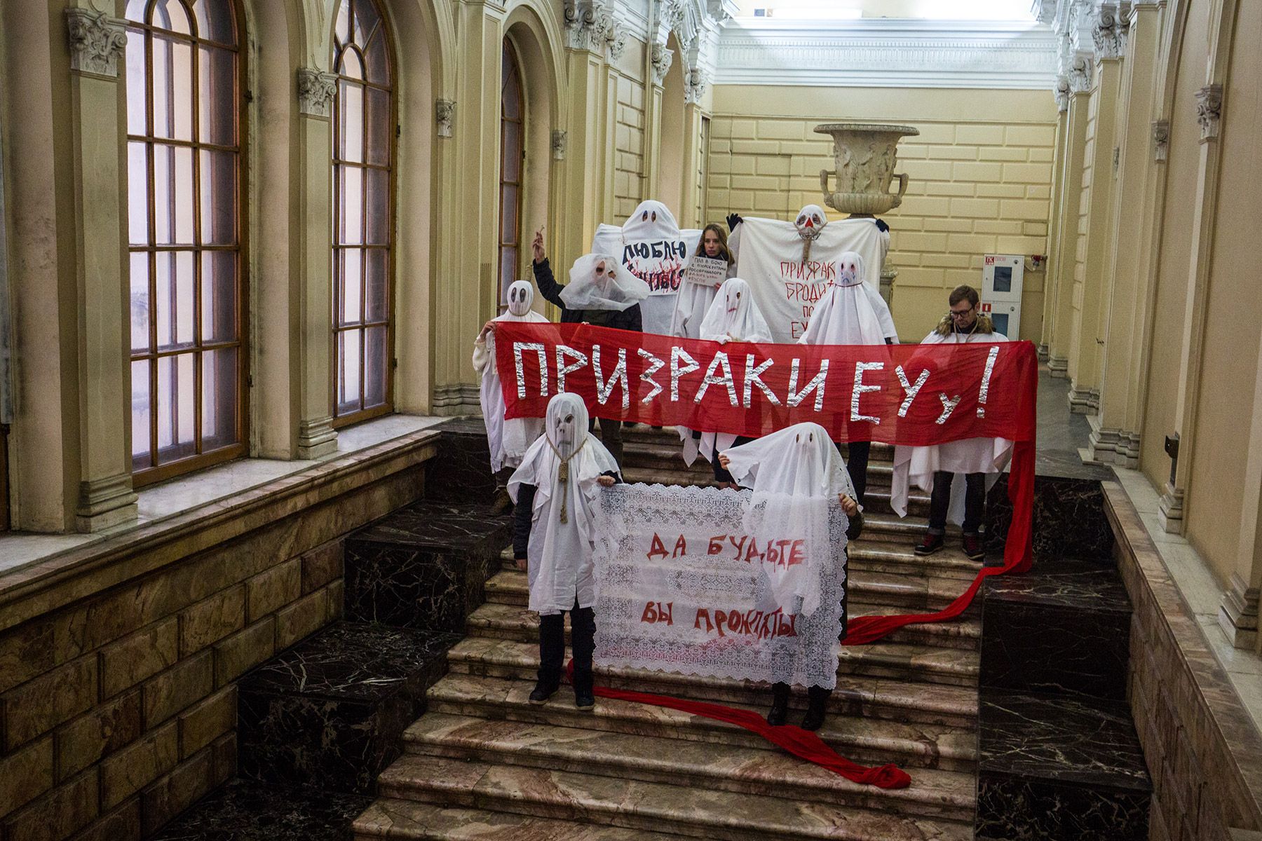 Давид Френкель Студенты и выпускники Европейского университета в Санкт-Петербурге устроили акцию против отзыва лицензии у вуза. Они прошли по центру города в костюмах призраков, скандируя требование вернуть лицензию. Европейский университет в Санкт-Петербурге — один из лучших негосударственных вузов России. Из-за отзыва лицензии он был вынужден отчислить студентов.