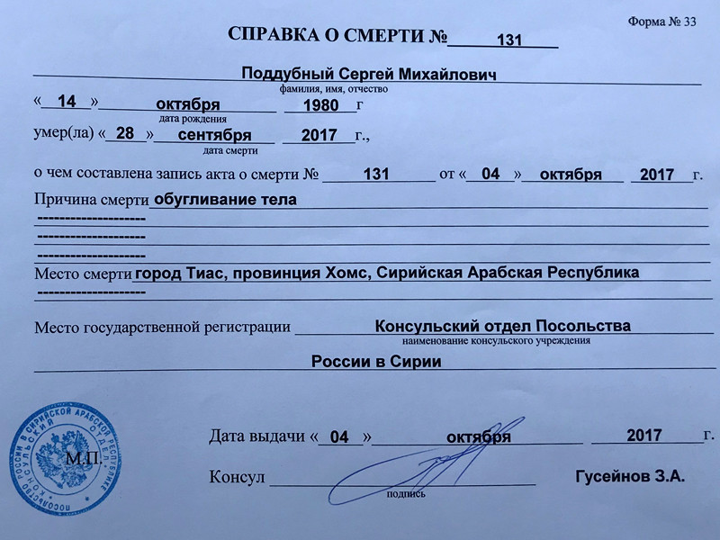 Агентство ознакомилось со справкой о гибели 36-летнего жителя Краснодарского края Сергея Поддубного, выданной 4 октября. В документе указывается, что его смерть наступила от "обугливания тела" в городе Тиас провинции Хомс. При этом справка идет под номером 131. Именно из этого журналисты сделали вывод о количестве погибших в Сирии россиян.