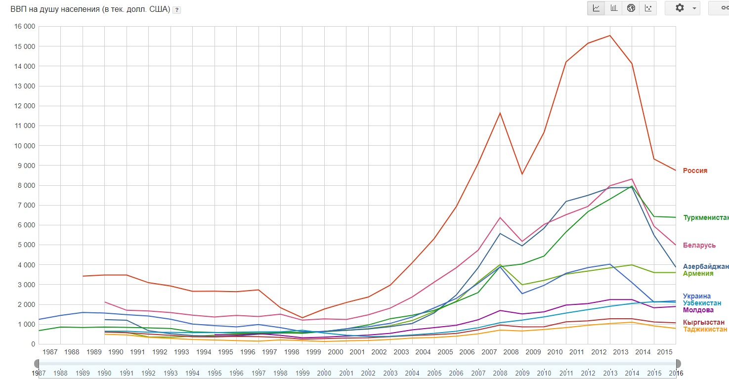 Для сравнения, ВВП на душу населения с учетом ППС в Таджикистане Moody's оценивает в $3093, в Киргизии — в $3262. Разумеется, это данные за 2016 год, а в сообщениях информагентств речь идет о прогнозах на 2017−2018 годы, но непонятно, как такое отставание можно преодолеть, тем более что, согласно тем же сообщениям, в прогнозе Совгиры говорится, что по росту ВВП Украина в 2018 году будет опережать страны СНГ. Прогноз роста ВВП России, данный, согласно сообщению РИА Новости, представителем Moodys — «превысит $10 000» — выглядит очень оптимистичным: по данным МВФ, в 2016 году он составил $8928.