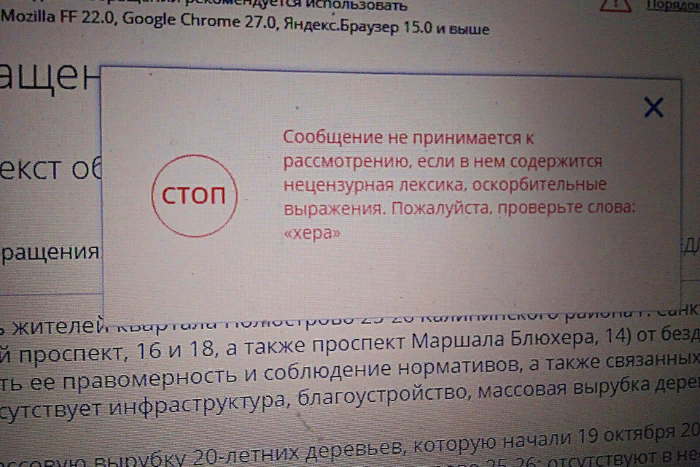 Ранее петербурженка рассказала, что электронная приемная Госдумы не приняла ее обращение, так как ошибочно нашла в нем нецензурное слово «хера» в названии проспекта Маршала Блюхера. Беляева добавила, что жаловалась чиновникам на незаконную вырубку деревьев.