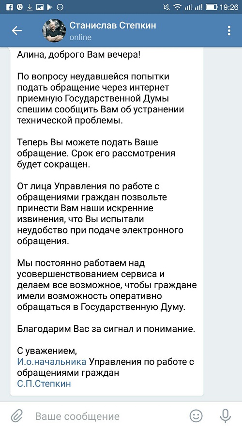Петербурженка Алина Беляева, чью жалобу электронная приемная Госдумы не приняла из-за «хера» в названии проспекта Маршала Блюхера, рассказала, что чиновники извинились перед ней и пообещали сократить срок рассмотрения обращения. Беляева опубликовала во «ВКонтакте» скриншот переписки с сотрудником приемной.