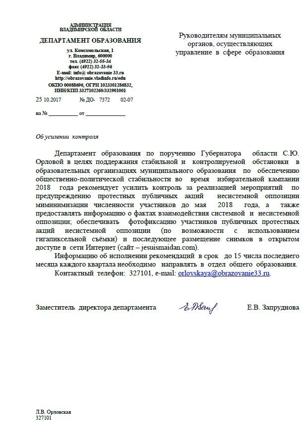 Департамент образования Владимирской области разослал письмо руководителям органов управления в сфере образования с требованием собирать данные о детях, участвующих в акциях «несистемной оппозиции», организовывать съемку участников акций протеста и публикацию фото на сайте Jesuismaidan. Документ размещен в группе «Требуем освободить Навального 7.10 | Владимир».