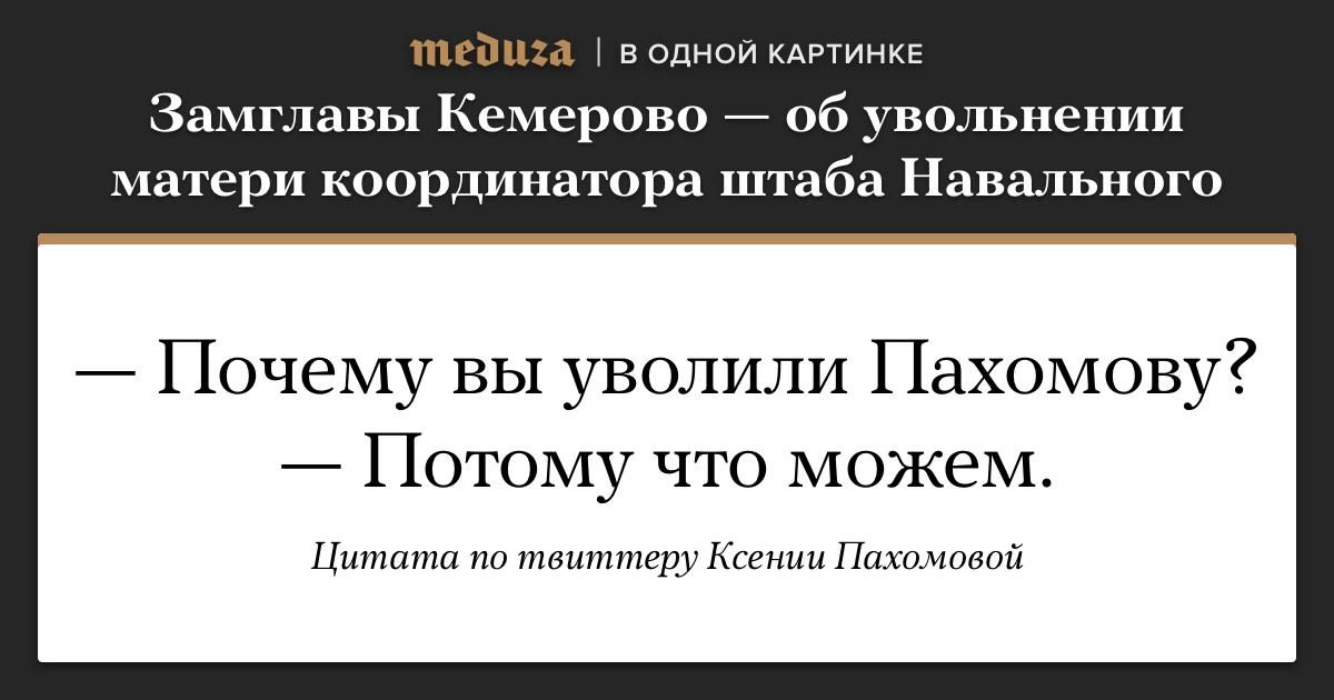 Вчера мы рассказывали про Ксению Пахомову, которая с августа 2017 года руководит кемеровским штабом Алексея Навального. С тех пор ее мать уволили с поста директора школы искусств, парня отчислили из магистратуры, а бабушке грозят увольнением. Сегодня появилось два обновления. Во-первых, выяснилось, почему мать Пахомовой выгнали с работы (ответ на картинке ниже). Во-вторых, ее парня восстановили, поскольку была нарушена процедура отчисления, — это не значит, что его не выгонят вновь.