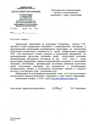 В своем письме Департамент образования ссылается на указание губернатора Владимирской области и призывает руководителей образовательных учреждений обеспечить «общественно-политическую стабильность» и усиленно заняться уменьшением числа участников протестных акций вплоть до мая 2018 года. Более того, Департамент требует ежеквартальных отчетов о выполнении поставленных задач.