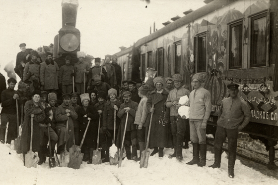 © Частная коллекция Очистка железнодорожного пути от снега сотрудниками агитпарпоезда «Красный Восток». Станция Чукусу, 1920 год С 22 ноября по 21 января в галерее «На Шаболовке» объединения «Выставочные залы Москвы» откроется выставка «Агитпоезда», организованная совместно с фондом «История Отечества» и Государственным центральным музеем современной истории России.