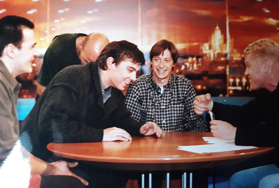 © Из личного архива Светланы Бодровой Сергей Бодров, Кирилл Пирогов, Иван Демидов на сьемках фильма «Брат-2» в студии телеканала ТВ-6 — Вам фильм понравился?