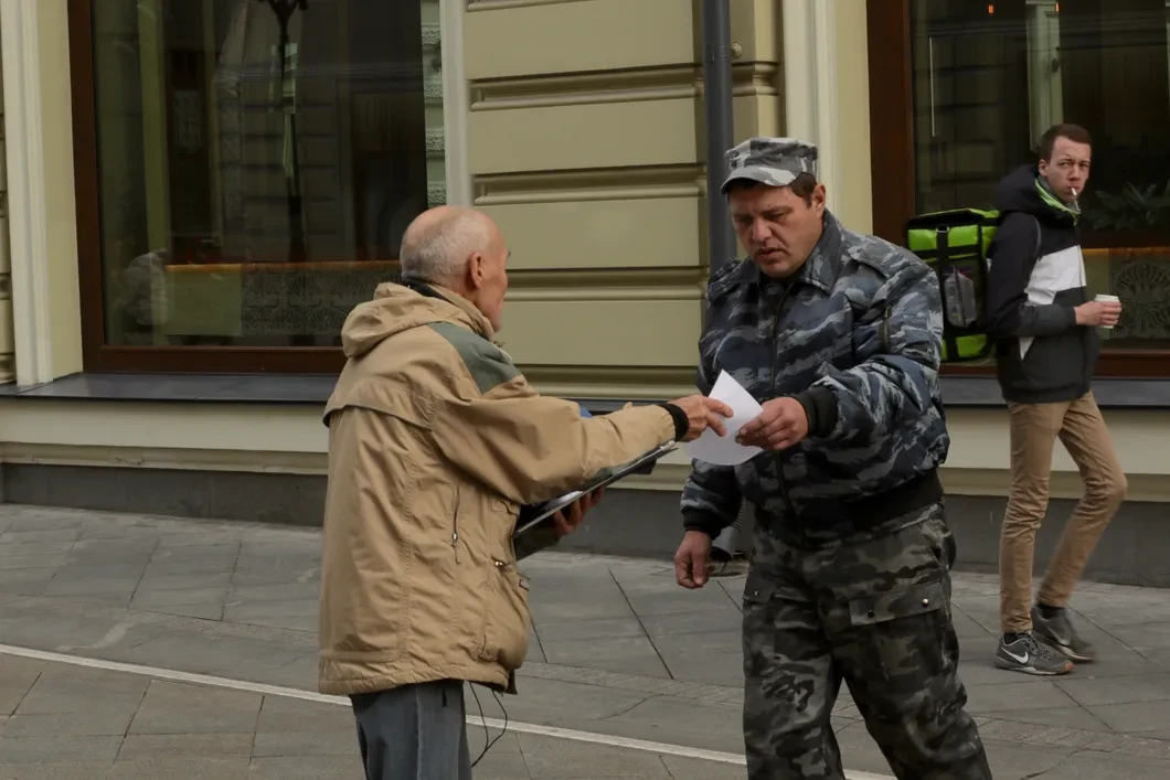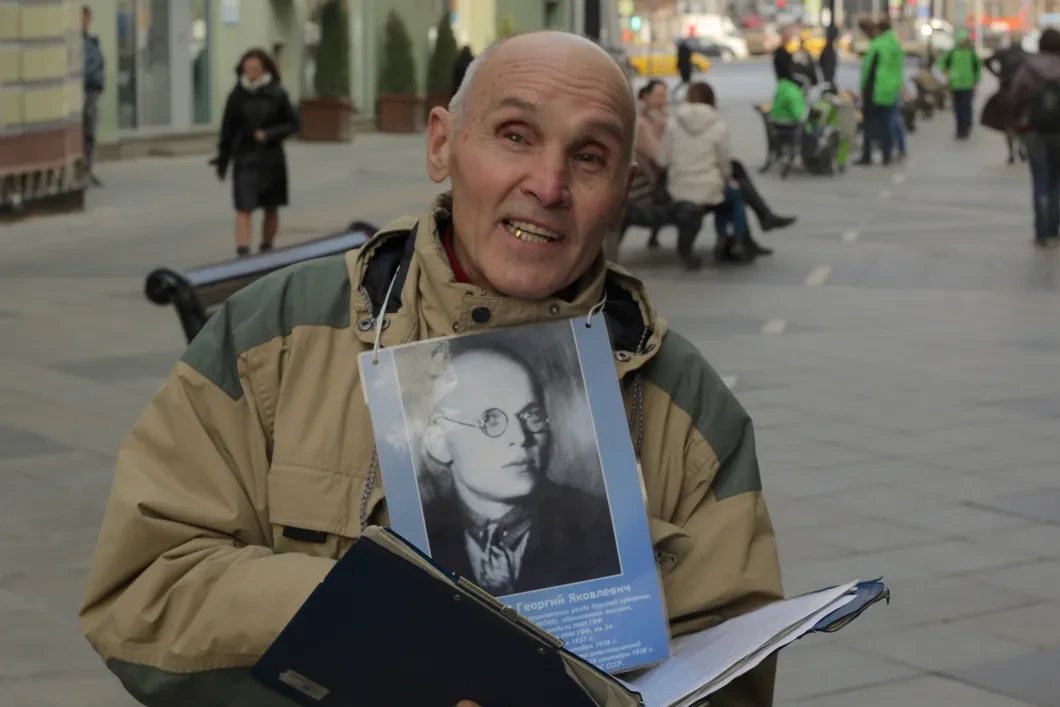 Спустя час после начала пикета к Нестеренко все-таки подходит полицейский, спрашивает документы. Привычным движением, не прерывая рассказ о преступлениях Сталина, Нестеренко достает паспорт. Все тем же лекторским тоном объясняет, что он «признанная жертва политических репрессий» и что было в доме, у которого он стоит. Пока один сотрудник полиции записывает паспортные данные, второй фотографирует плакаты и самого Нестеренко. Тот как ни в чем не бывало продолжает давать интервью. За эти пять лет он всего раз попал в отделение на Китай-городе. Там полицейские пробили его по базе, сказали, что он «не их клиент», и отпустили. Нестеренко, кажется, не обратил на это большого внимания: «Все страхи, которые сегодня, ни в какое сравнение не идут с тем страхом, в который загнал всю страну Сталин».