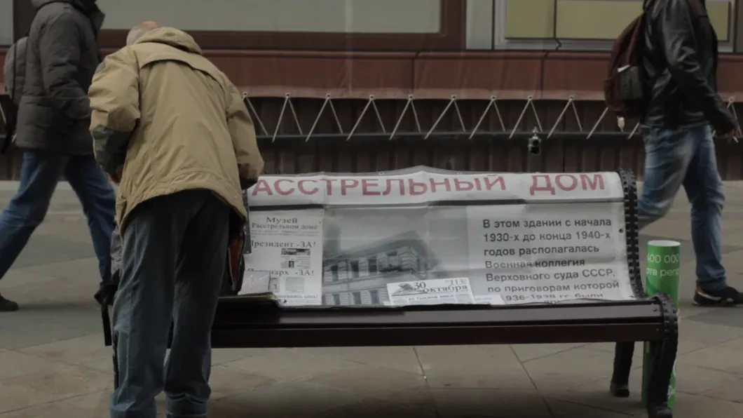 Охранники расстрельного дома настороженно смотрят на нас, один, побродив вокруг, подходит к плакатам, читает. Когда Нестеренко обращает на него внимание, неестественно улыбается в камеру, тянет: «Чи-и-из». Вдруг спрашивает: