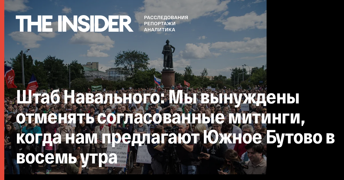 Штаб политика Алексея Навального отменяет некоторые согласованные акции, но это происходит в тех случаях, когда власти в качестве альтернативных площадок предлагают «Южное Бутово в восемь утра». Об этом The Insider сообщил глава избирательного штаба Навального Леонид Волков, комментируя заявление МВД о том, что Навальный не является на согласованные митинги.