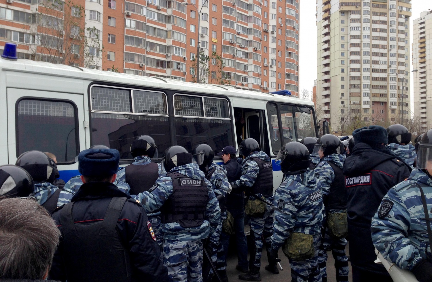 После того как люди начали выходить через рамки, начались точечные задержания. Так, у входа на акцию были задержаны около 10 человек, их всех посадили в один автозак.