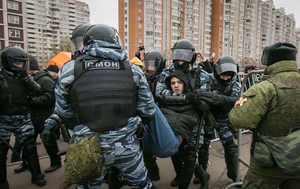 Людей задерживали выборочно, но достаточно жестко. Во время задержания одного из мужчин девушка в камуфляжной форме пыталась вырвать его из рук ОМОНа, однако ОМОНовцы грубо отстранили ее. В результате был снесен невысокий зеленый забор, ограждающий участок земли, на котором произошел инцидент, а сама девушка упала на землю.