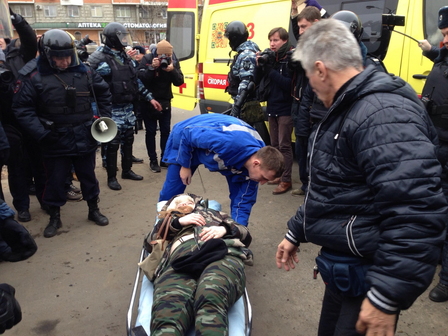 Девушка лежала, не двигаясь: очевидно, ей было плохо. Правоохранители потеснили собравшихся, образовав вокруг девушки небольшое кольцо, однако оказать помощь ей никто не попытался. Позже к ней прорвался пожилой мужчина. «Я врач, вашу мать. Отстаньте от меня, она больна», — заявил он присевшему рядом с девушкой сотруднику ОМОН. Врач спросил у девушки, как она себя чувствует, однако она не ответила. Осмотрев ее, он сообщил, что у нее очень высокий пульс. Позже на место инцидента приехала машина реанимации, и девушку увезли. В общей сложности она пролежала без сознания около 10 минут.