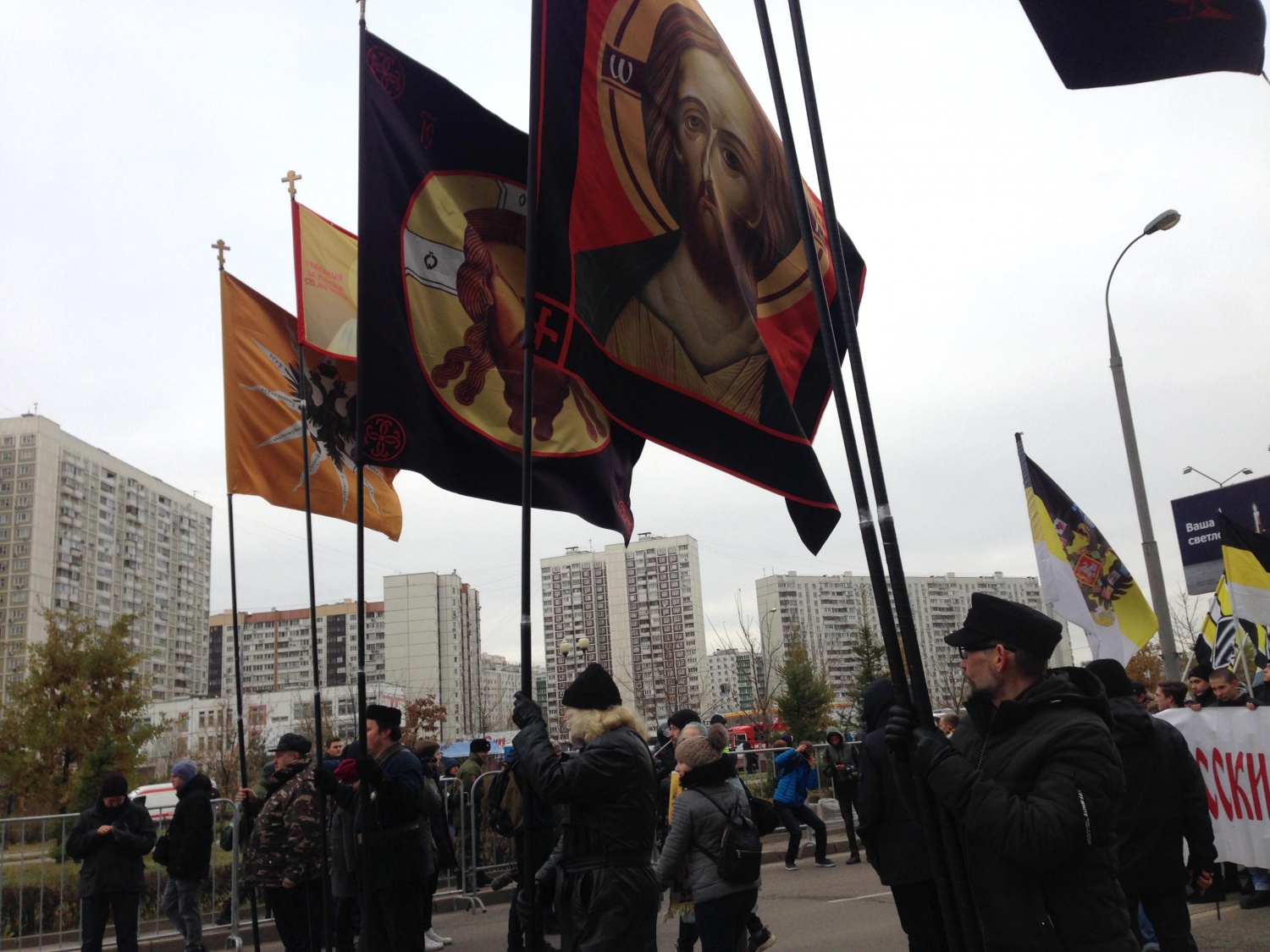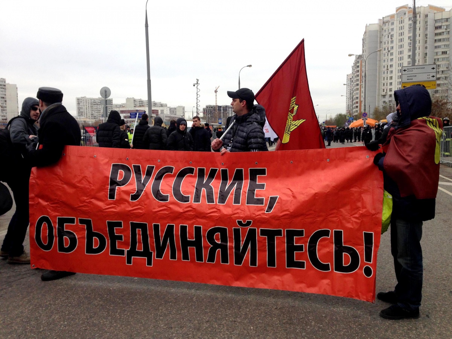 На традиционный «Русский марш» в московском районе Люблино вышли националисты, поддержавшие Украину в конфликте с Россией, в отличие от поддержавших Новороссию, которые собирались у метро «Октябрьское поле».