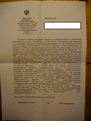 Я посоветовался со своим юристом, и мы решили составить еще одну жалобу. Я пошел в «Сбербанк», попытался заплатить, естественно, ничего не вышло. Попросил официальную бумагу об отказе принять квитанцию о штрафе. В «Сбербанке» долго созванивались, сказали, нужно писать заявление, ответ на него может 15 дней идти. Но ответ мне пришел тут же. На основании этой бумаги я написал жалобу в прокуратуру Кировского района с копиями в Кировский районный суд и в городской суд Санкт-Петербурга. Мне пришел ответ только из Кировского районного суда, но зато испуганный: это не мы ответственные, а полиция, но мы выяснили для вас ваши УИНы и их вам сообщаем.