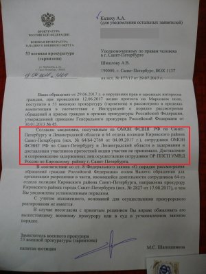 На жалобы об условиях содержания Кировская районная прокуратура ответила мне, что… мы все врем. Если кратко. Например, на нашу претензию, что не был допущен адвокат, они пишут: а где доказательства, что он приходил? Наша жалоба на условия содержания в ОП 64 отражена в решении городского суда Санкт-Петербурга, но была, конечно, проигнорирована. Потом подали в ЕСПЧ, там условия содержания в ОП 64 описаны подробно.