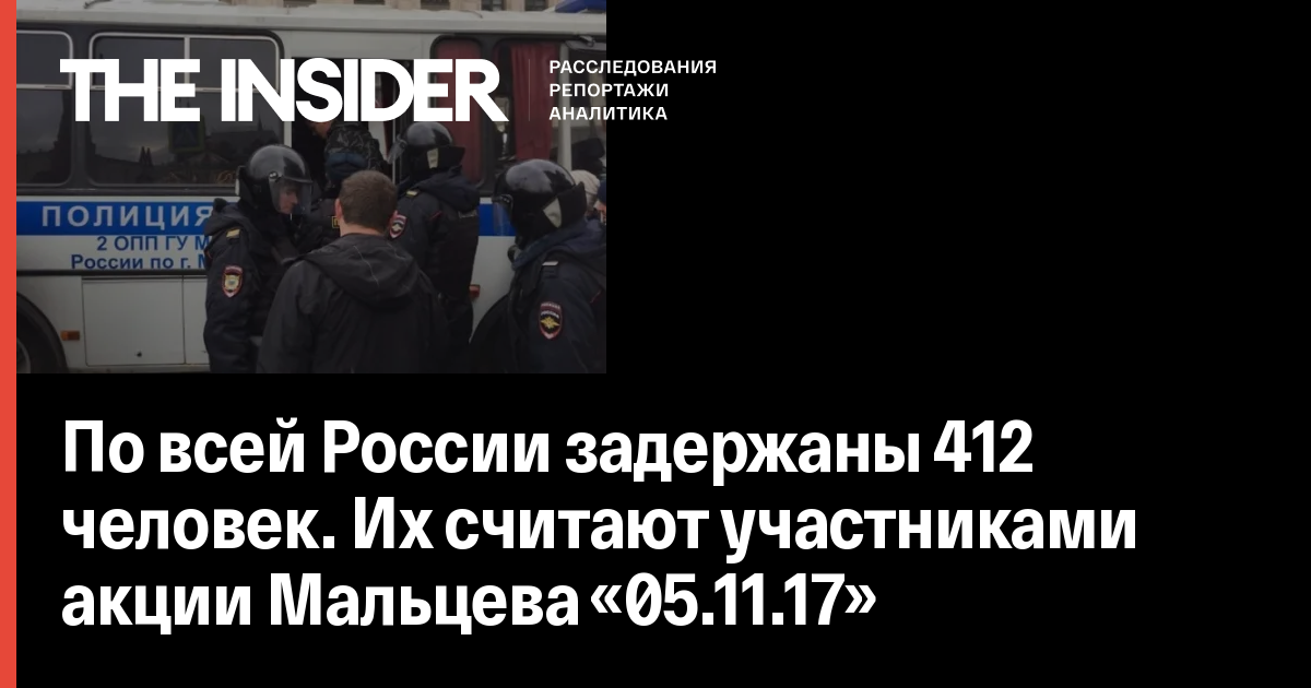 По данным на 18:00 по всей России задержаны 412 человек, сообщает «ОВД-Инфо». Их задержали по подозрению в причастности к акции националиста Вячеслава Мальцева и движения «Артподготовка» под названием «05.11.17».