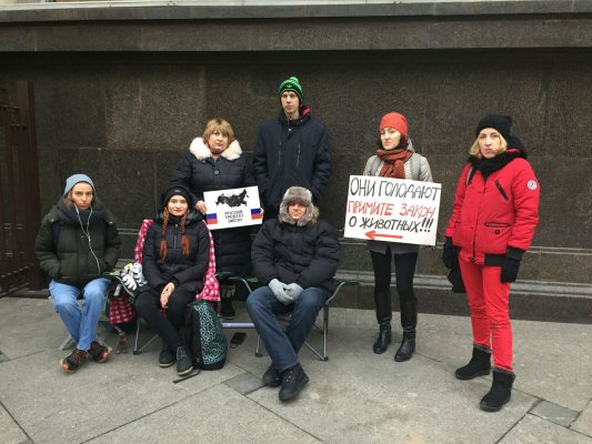 В рамках акции зоозащитники требуют второго чтения законопроекта «Об ответственном обращении с животными» в ноябре. Двое из них объявили голодовку.
