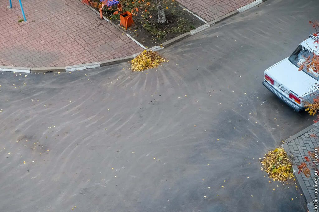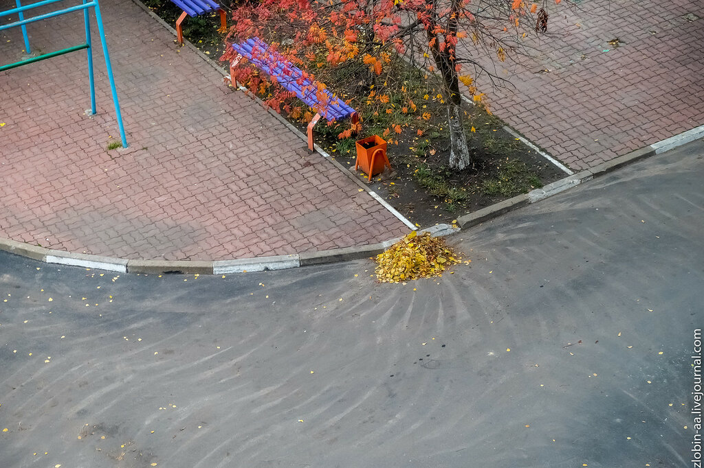 Встретить у нас во дворе дворника - та еще задачка! И во дворе чистота всегда, и специалиста по уборке не видно. Когда успевают порядок наводить - фиг его знает. А сегодня увидел прекрасное - несколько больших куч из палой листвы и странные узоры на асфальте. Современное искусство, чо уж. Даже жаль будет, когда листья уберут и дожди смоют узор :-( Хоть табличку ставь - Осторожо! Не вляпайтесь в современное искусство :-) Кстати, да. Снега у нас еще нету. И морозов нету. Ничо нету :-( А я, может, лыжи купить хотел?! Или сноуборд какой-нибудь... Есть же сноуборды с моторчиком?