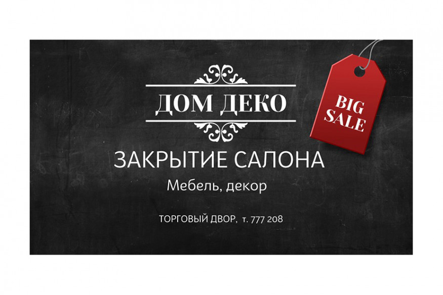 Sale-ликвидация салона «ДОМ ДЕКО ИНТЕРЬЕРЫ» проводится по адресу: Сыктывкар, ул. Первомайская, 62 («Торговый двор»), 2 этаж, т. +7(8212)777 208, страничка «ДОМ ДЕКО ИНТЕРЬЕРЫ» во «ВКонтакте».