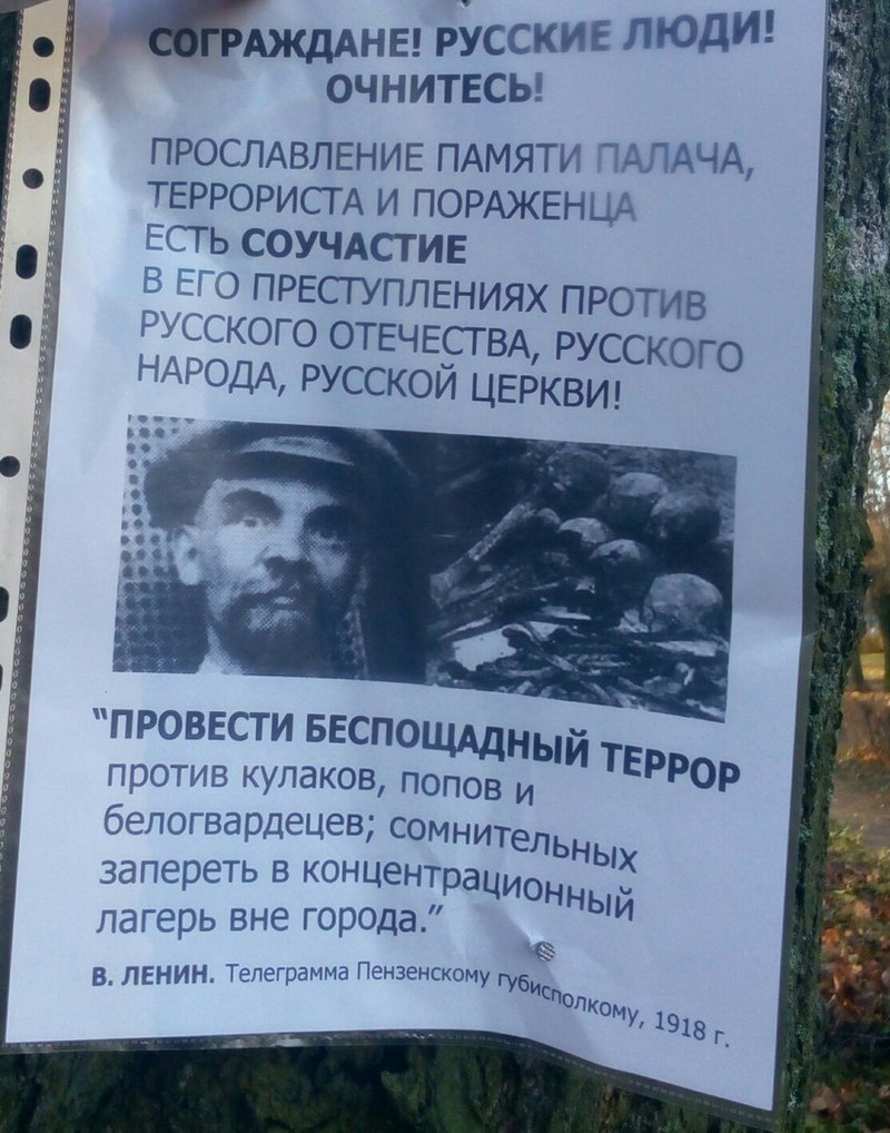 К деревьям вокруг памятника были гвоздями прибиты листовки с негативными оценками Ленина и текстами его распоряжений о казнях и заключении неблагонадежных граждан.