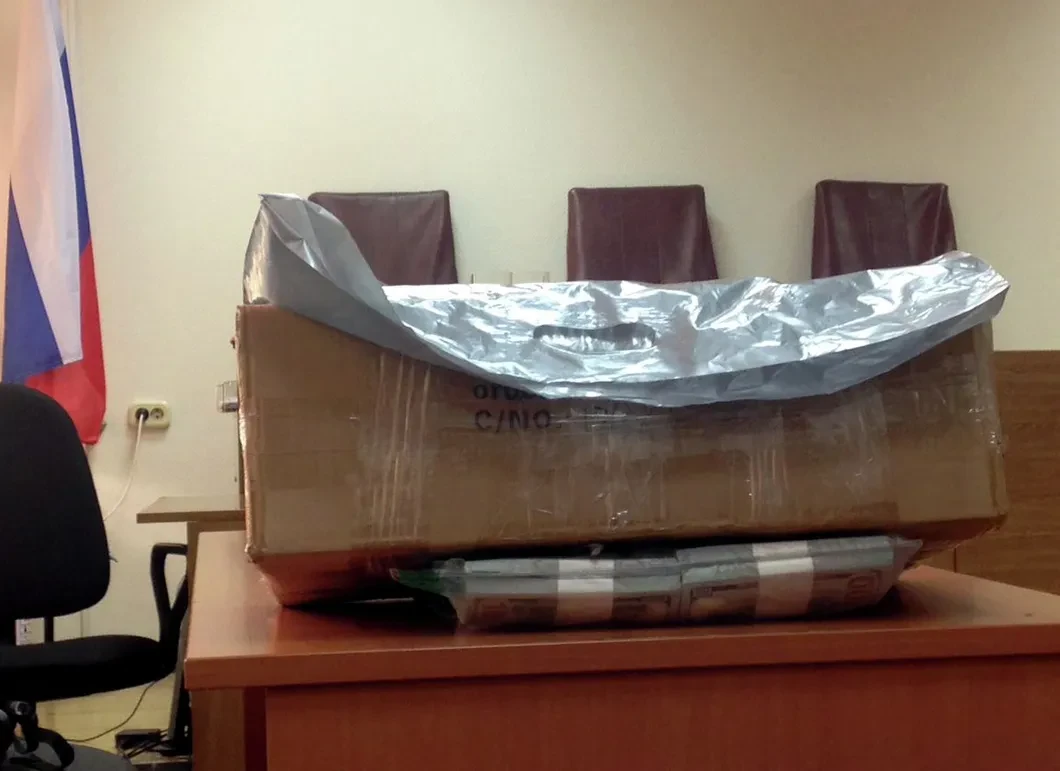 Утром 8 ноября на столе прокуроров неожиданно появилась большая картонная коробка, накрытая сверху пластиковым пакетом (чтобы нельзя было прочесть надпись на печати Следственного комитета). В пакете были уложены пачки 100-долларовых купюр.