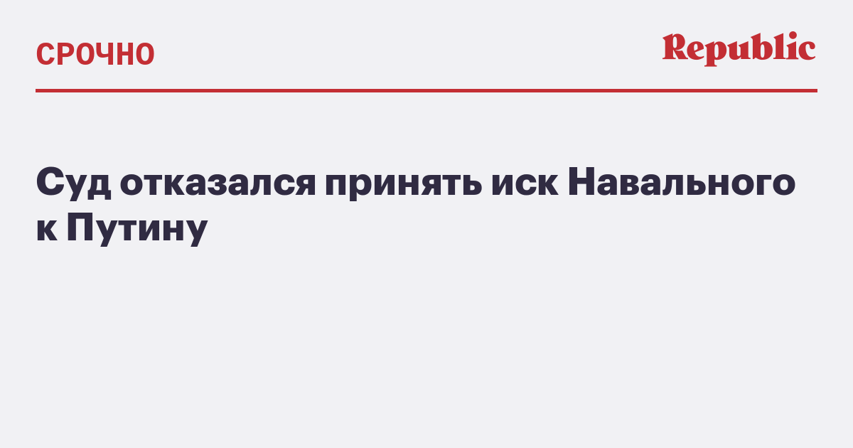 Тверской районный суд отказался принять иск оппозиционера Алексея Навального к президенту России Владимиру Путину. Об этом юрист Фонда борьбы с коррупцией (ФБК) Иван Жданов написал в фейсбуке.