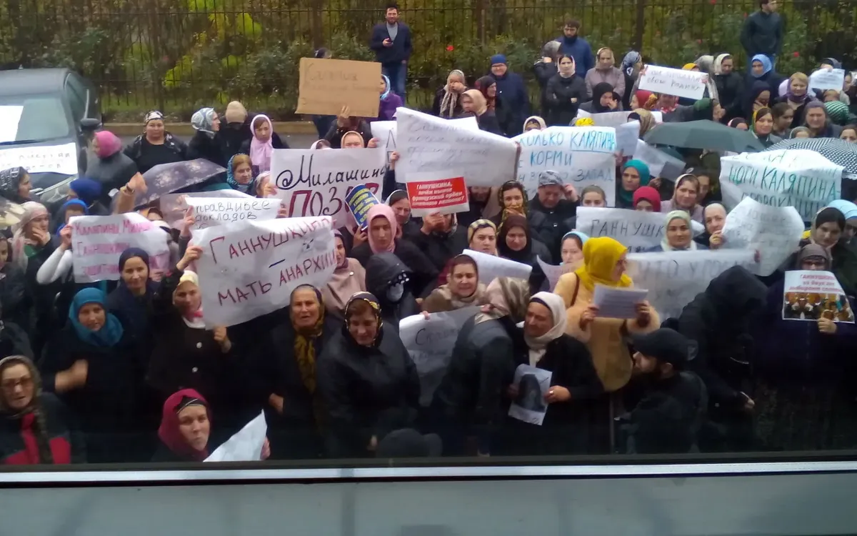 В их руках были плакаты: «Ганнушкина — мать анархии», «Каляпин — комитет против мира», «Милашина — позор России», «Предать Родину — преступление без срока давности», «Базарные доклады Каляпина правдивее смерти», «Каляпины Милашины, Ганнушкины — защитники террористов» и т.д.