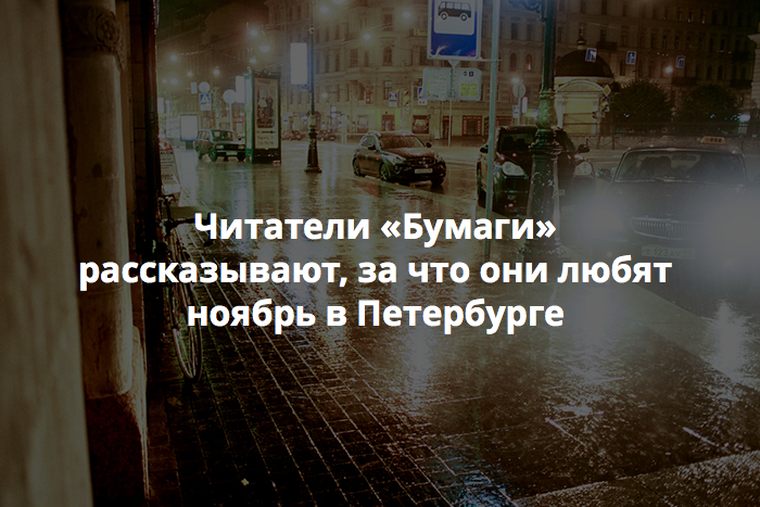 Почему именно в ноябре стоит ходить в театры и кино, какие капризы можно оправдать осенней хандрой, чем петербургская осень отличается от сибирской и что помогает пережить промозглую погоду? «Бумага» публикует ответы читателей на вопрос о том, что хорошего в одном из самых темных месяцев в году.