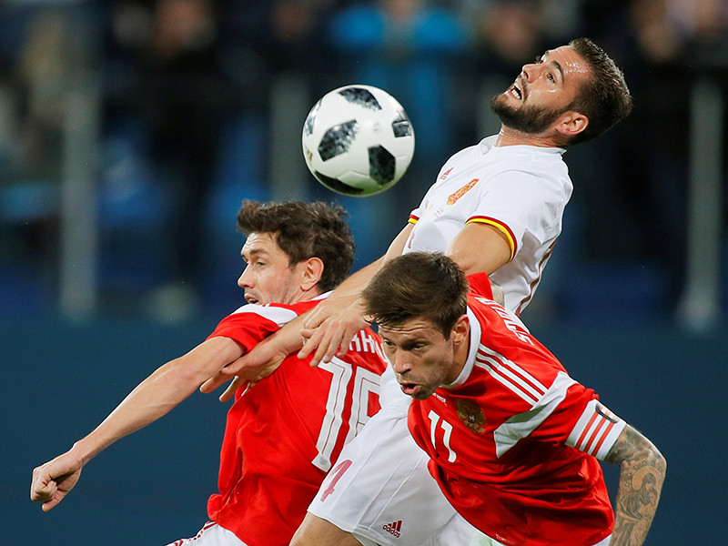 У россиян дублем отметился нападающий Федор Смолов (41', 70'), еще один мяч забил полузащитник Алексей Миранчук (51'). Ворота Андрея Лунева дважды с пенальти поразил капитан испанцев Серхио Рамос (35', 54'), а открыл счет в матче защитник Жорди Альба (9').