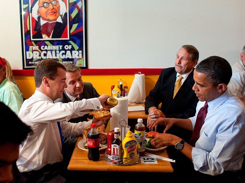 Д.Медведев и Б.Обама завтракают гамбургерами / wikipedia.orgю Закон США о санкциях против компаний, сотрудничающих с российским энергетическим сектором, означает заморозку текущих отношений США и России на десятилетия. Об этом заявил премьер-министр РФ Дмитрий Медведев.