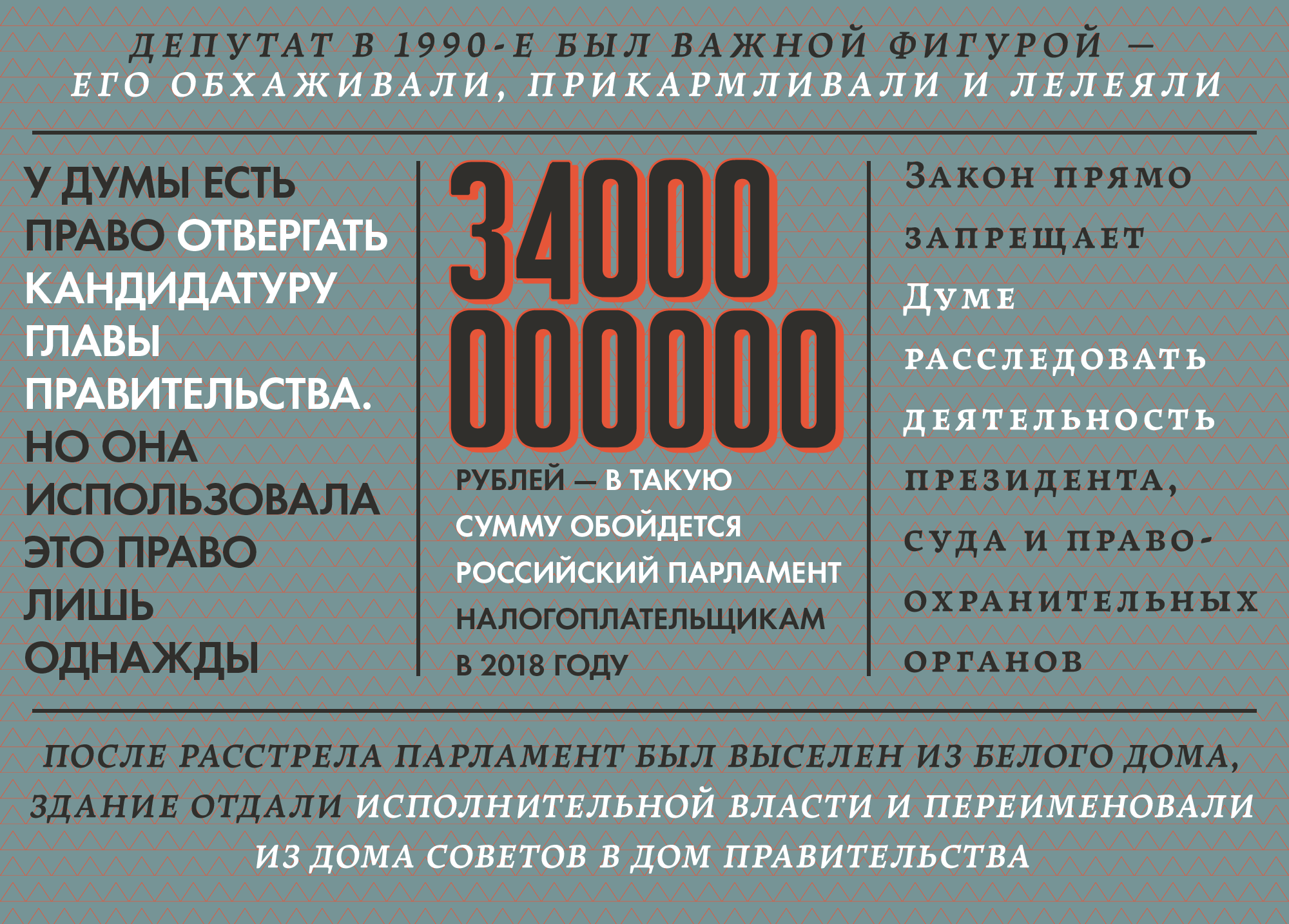 Возможность править указами позволяла президенту обходиться без поддержки парламента. Там, где обойтись без нее было нельзя – требовался закон, в ход шло маневрирование. Обычной практикой в 1990-х были теневые договоренности как с лидерами фракций, так и с отдельными депутатами. Отсюда – специфический флер продажности, который окутал парламент в те бурные годы. Депутат тогда был важной фигурой с той точки зрения, что его обхаживали, прикармливали и лелеяли.