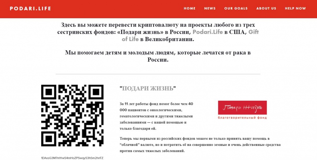 Он был выбран как самый известный и надежный. Полученные криптовалюты фонд может конвертировать в доллары США и расходовать на благотворительные нужды, в том числе и на нужды сестринских фондов: российского «Подари жизнь» или английского Gift of Life.