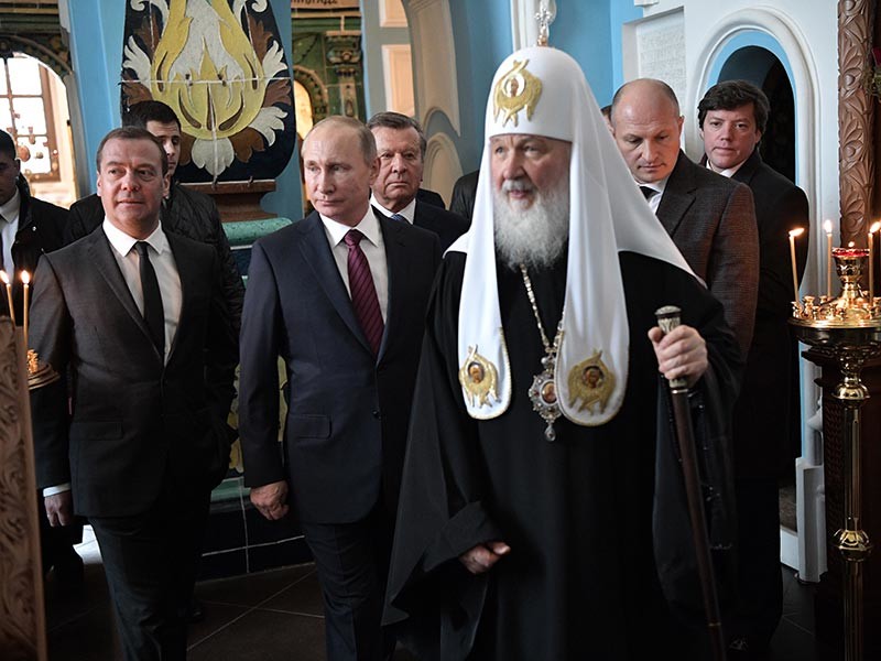 Президент РФ Владимир Путин, премьер-министр Дмитрий Медведев и Патриарх Московский и всея Руси Кирилл стали первыми паломниками подмосковного Воскресенского Ново-Иерусалимского монастыря, в котором на днях завершился первый этап многолетних реставрационных работ.