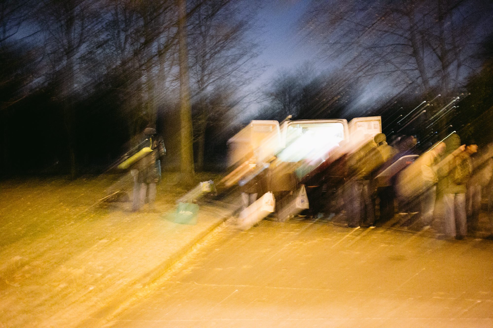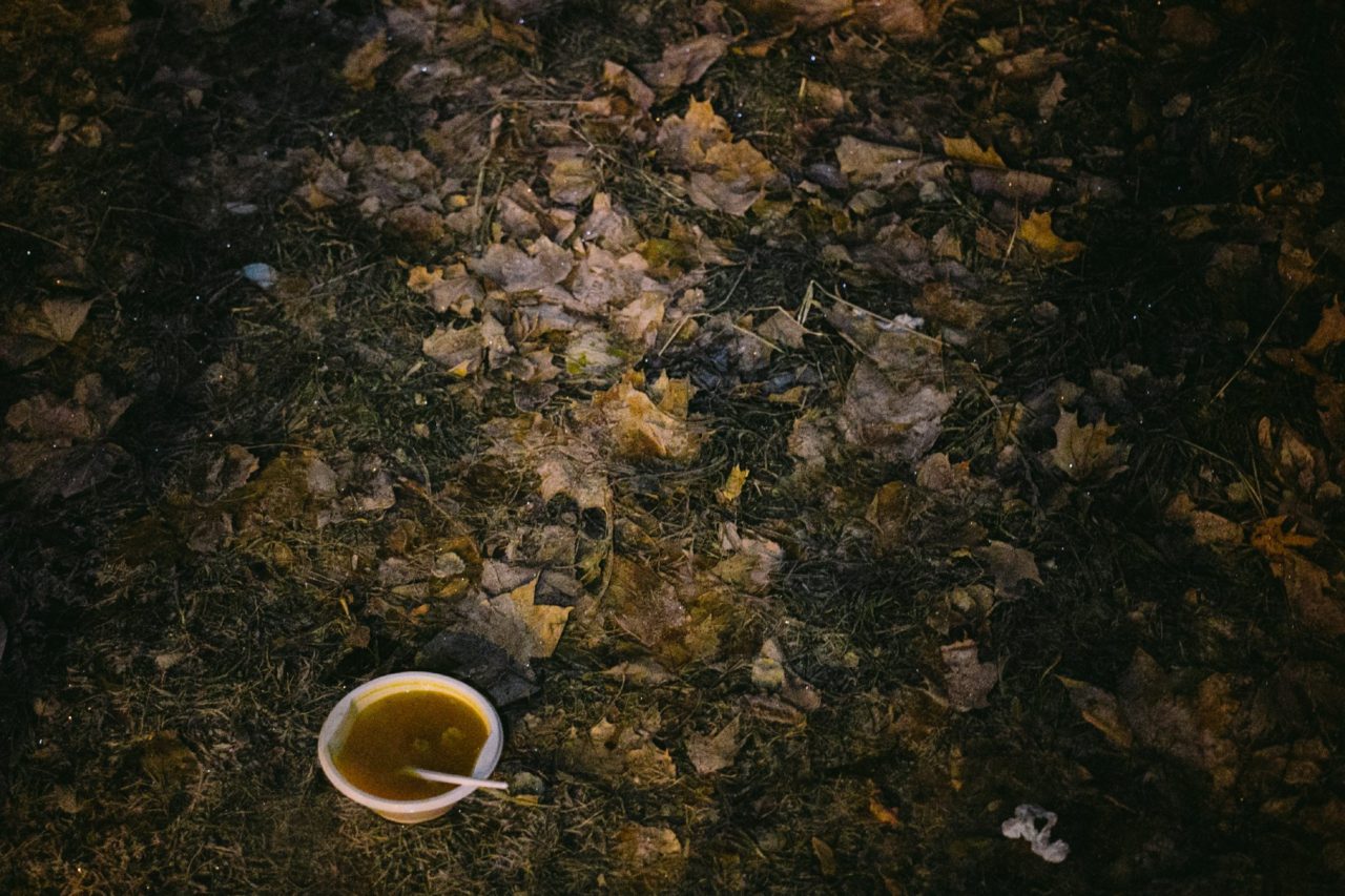 Тарелка супа на стоянке ночного автобуса «Ночлежки»Фото: Наталья Булкина для ТД На причердачок, помню, зашел, а там какой-то сталинист, который пятнадцать лет отсидел. Я только вещи все принес — семь этажей, шесть сумок, два матраса. Он говорит — уходи. Мороз был 18 градусов. Еще сосед пришел, говорит — я электрошок принесу, мы его сейчас электрошоком. Пришлось все вытаскивать и на улице танцевать до утра.