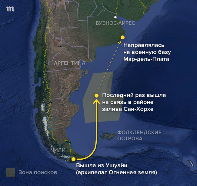 Подлодка «Сан-Хуан» должна была 19 ноября прибыть на место своей постоянной дислокации — военно-морскую базу Мар-дель-Плата. Субмарина с 44 членами экипажа на борту возвращалась с архипелага Огненная Земля на юге Аргентины. 15 ноября судно перестало выходить на связь. К тому времени подлодка преодолела примерно половину пути и находилась в районе залива Сан-Хорхе. Где сейчас «Сан-Хуан», неизвестно.