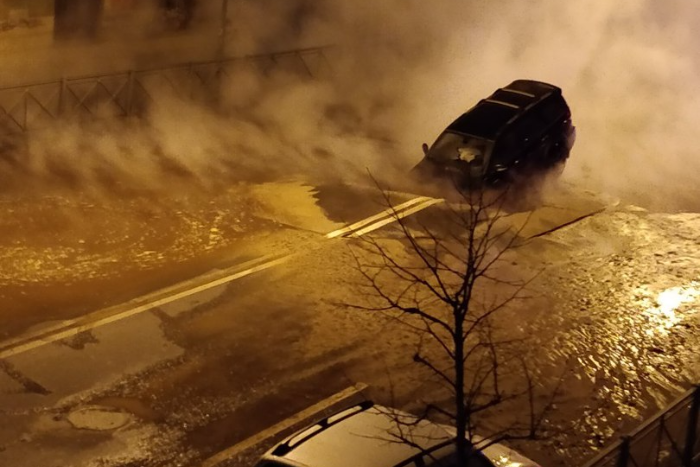 В Подъездном переулке из-за прорыва трубы с кипятком машина провалилась в размыв