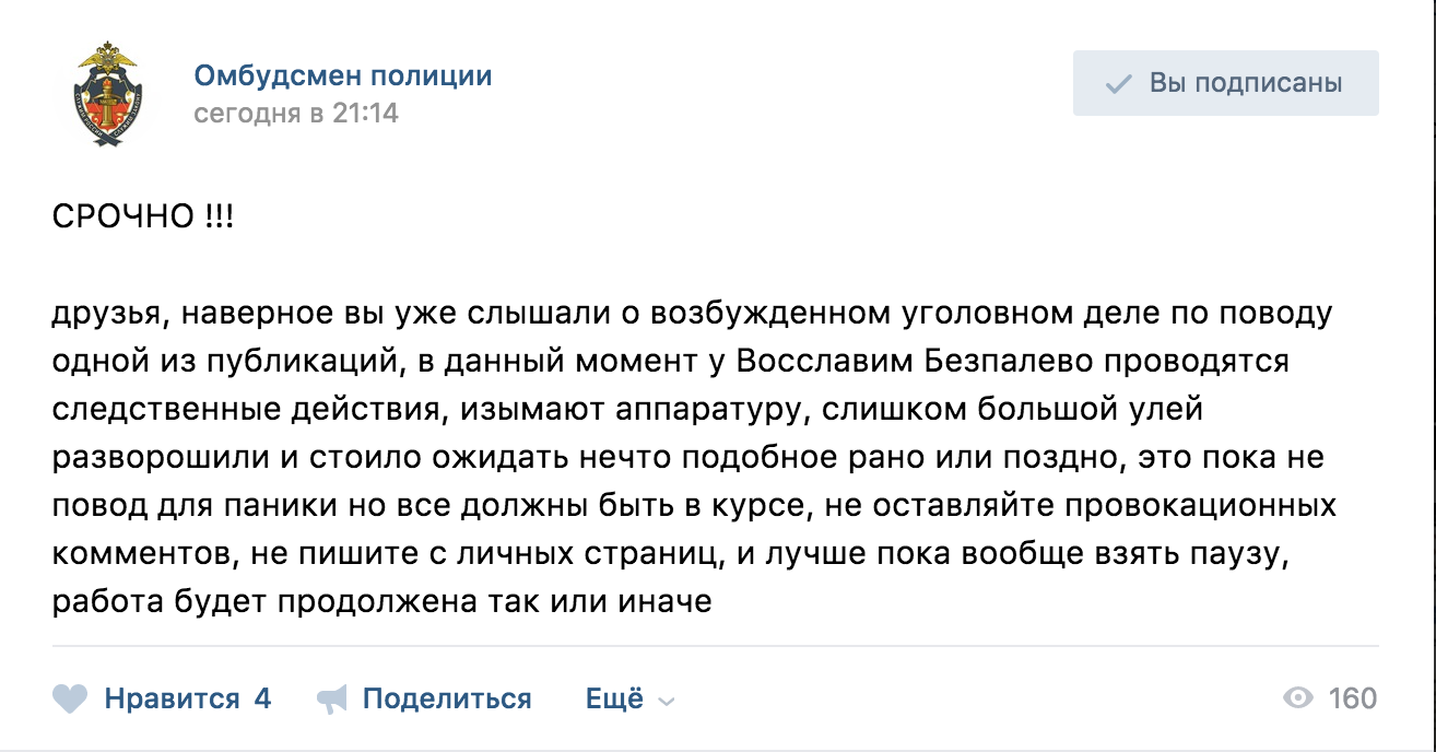 В паблике «Омбудсмен полиции» «ВКонтакте» сообщается о возбужденном против его администратора уголовном деле и обыске, который проводится сейчас у него дома. В сообщении отмечается, что у администратора группы, пишущего под псевдонимом «Восславим Безпалево», проводятся следственные действия, силовики изымают аппаратуру.