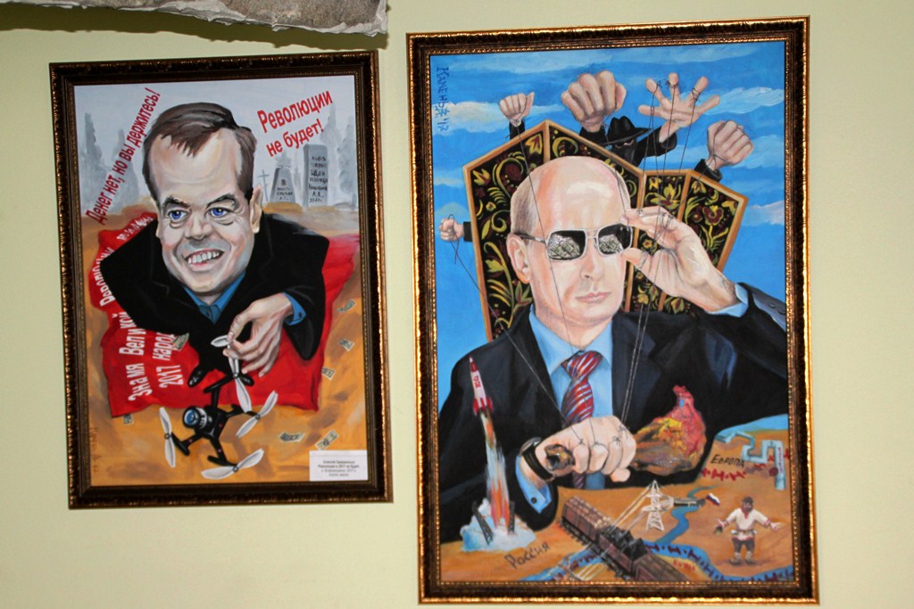 А к выставке я уже изобразил современных политиков – Путина и Медведева. На картине с премьером через квадрокоптер передал историю с Навальным. Ситуация действительно неоднозначная: народу показали эти царские дачи – смотрите, воруют, смотрите, жируют. Народ где-то вышел, побурчал и все забыли. Это мне непонятно. Чего все боятся? Что их убьют?!