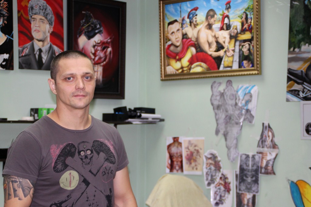 – Средний класс. Цены небольшие. Если члены местного союза художников рисуют портреты от 35 тысяч рублей, я свои работы отдаю за символические 5 тысяч рублей. Самые востребованные – портреты Высоцкого и Цоя, их чаще всего заказывают. На заказ рисовал Фиделя Кастро: в спортивной олимпийке и камуфляжных штанах с сигарой в руке и двумя часами, отобразив в одном рисунке всю его натуру. Человек остался очень доволен. Татуировки набиваю совершенно разные, кто-то приходит с готовым эскизом, кто-то с идеей. Любую свою картину могу изобразить в виде татуировки. Так, к примеру, человек сначала купил Анджелину Джоли в образе медузы-горгоны со змеями вместо волос, а затем решил перенести ее на свое тело.