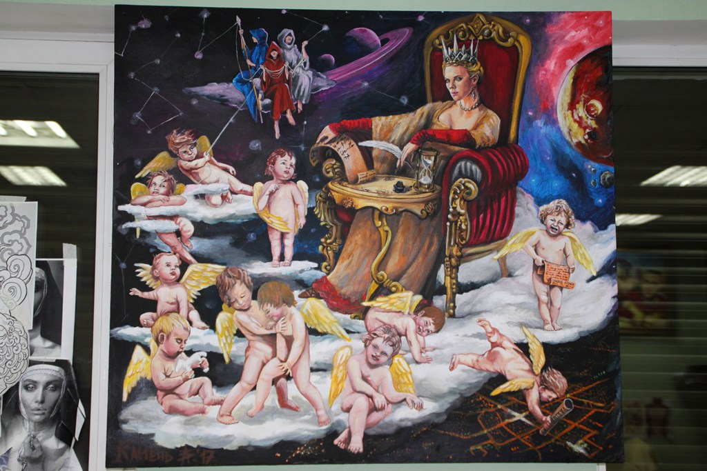Есть несколько психологических работ. Изобразил Судьбу на троне, раздающую сценарии жизни душам в образе ангелочков. А на заднем плане слепые Ариадны плетут нить судьбы. Сначала души бесполы, а затем получают свой заветный свиток и обретают земную сущность. Так один ангелочек настолько расстроен уготованной ему участью, что залился слезами. Еще одна картина – Борьба с внутренними демонами, где я изобразил себя, распинающего себя же на кресте. Так как мы сами для себя жертвы и хулители. А одна из моих любимых картин – Тату на сердце, так как татуировка – это и есть моя жизнь.
