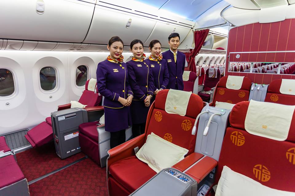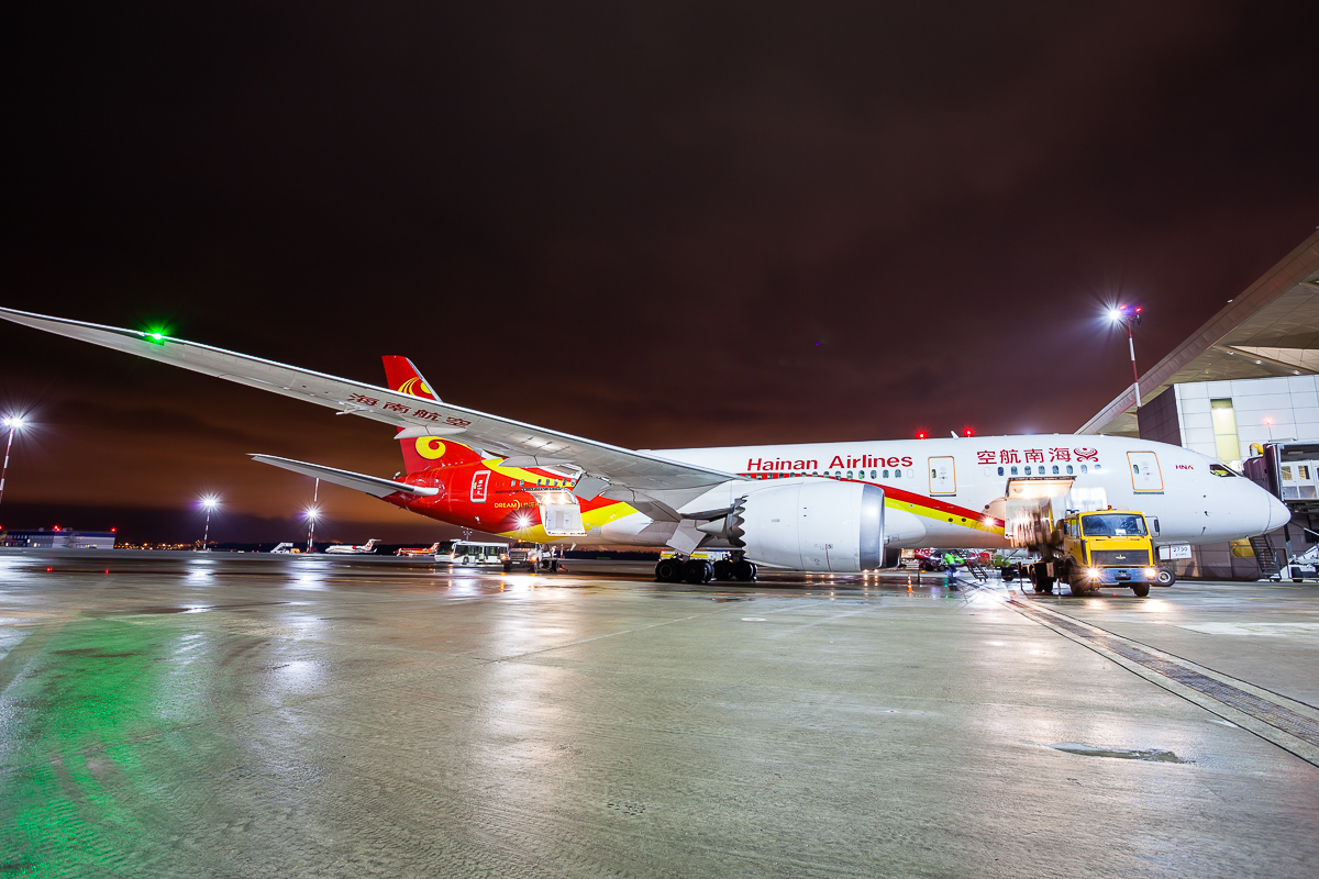 Китайская авиакомпания Hainan Airlines представила в Пулкове лайнер Boeing 787 Dreamliner — это первый самолет такого типа в петербургском аэропорту. Одна из отличительных черт самолета — наличие в салоне бизнес-класса 35 кресел, раскладывающихся в полноценные кровати.