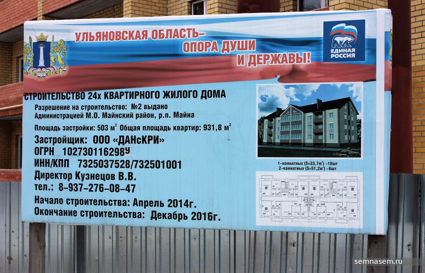 Весной 2014 года в поселке Майна Ульяновской области заложили дом на 24 квартиры, половина из которых предназначалась для выпускников Майнского детского дома. На красивом баннере написали срок сдачи — декабрь 2015 года. Районная газета «Ленинец» написала: «В течение 2014 года в Майне должны построить еще один новый многоквартирный жилой дом [незадолго до этого события в поселке быстро и качественно построили дом для ветеранов войны]. Свои серьезные намерения относительно этого губернатор С. И. Морозов и представители подрядной организации подтвердили осмотром площадки под строительство».