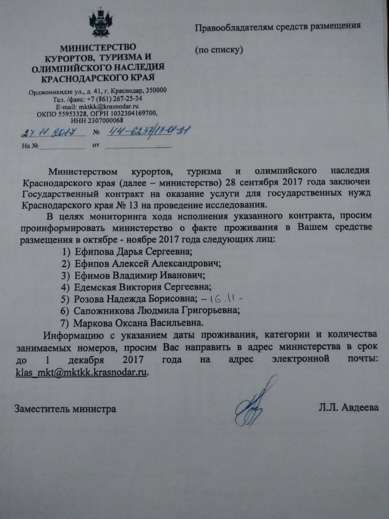 Правда уже сейчас вбивается с помощью клавиатуры в отчёты, и никуда не денется, но у кого-то сама проверка, видимо, вызвала сильную чесотку... Сначала пошли какие-то непонятные звонки на личные телефоны, в попытках выяснить, где жил тот или иной эксперт. Позже ситуация разъяснилась так, что ещё больше запуталась. Попало мне в руки вот такое смешное письмо… Согласно этому письму, Министерство курортов Краснодарского края… раскрывая персональные данные экспертов… до официальной сдачи отчёта… просит проверяемые гостиницы сообщить, проживали ли у них эксперты… которые «тайно» проверяют гостиницы по заданию этого же Министерства.