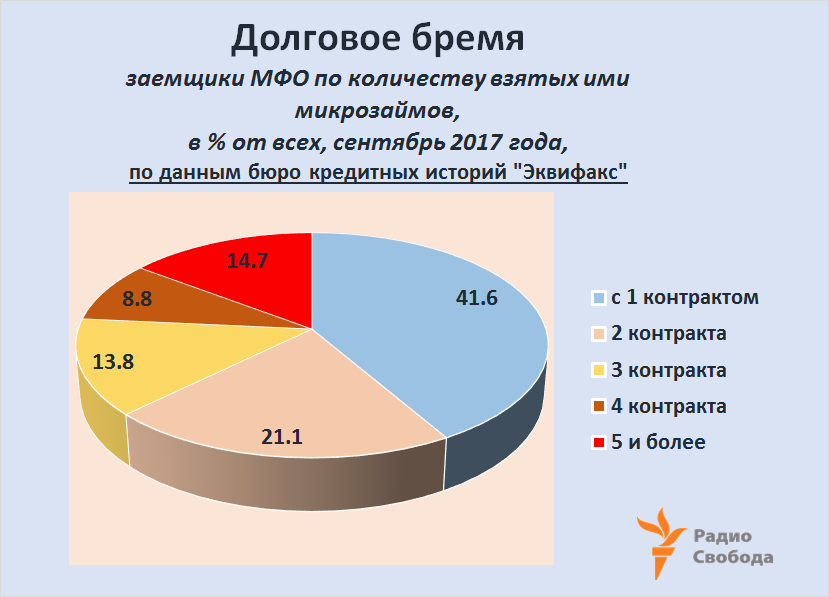 В сегменте микрозаймов, учитывая их относительно небольшие объемы, сложилась и своя структура долгового бремени, имея в виду количество действующих кредитов на одного заемщика. Если в банковском секторе России к концу сентября 2017 года 57% всех заемщиков имели по одному действующему кредиту, 24% – два кредита и 10% – три кредита, как отмечалось в обзоре, подготовленном бюро кредитных историй “Эквифакс”, то в сегменте микрозаймов доля заемщиков с тремя и более кредитами превышала 37%: