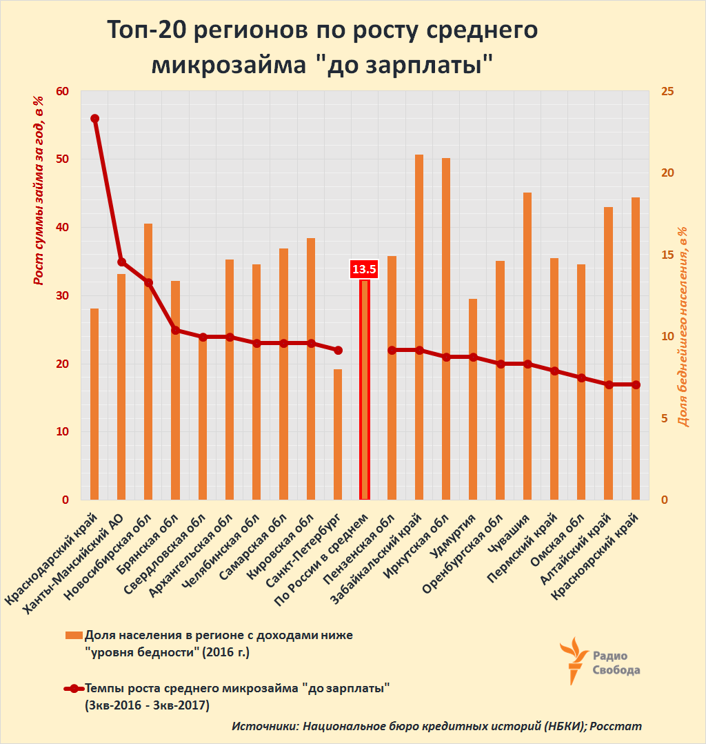 Национальное бюро кредитных историй (НБКИ) в конце октября представило данные по регионам России, где был отмечен наибольший рост среднего размера “займа до зарплаты” по сравнению с его уровнем в 3-м квартале 2016 года. Сам же такой микрозаем мог составлять от 18 тысяч 193 рублей в Москве (–0,4% за год) до 7 тысяч 153 рублей – в Кемеровской области (+10,4%). И в целом ряде указанных регионов доля населения с доходами ниже “прожиточного минимума” еще к началу 2017 года заметно превышала среднероссийский показатель (13,5%):