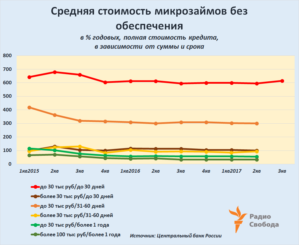 Выступая на недавней конференции, зампред Банка России Владимир Чистюхин посетовал и на возобновившийся рост стоимости наиболее мелких и “коротких” микрозаймов – на сумму до 30 тысяч рублей и предоставляемых на срок менее 30 дней. По его словам, полная стоимость такого кредита повысилась до 614% годовых!.. Впрочем, если судить по данным самого Центробанка, все последние годы она в 1,5–2 раза превышала стоимость следующего за ним “короткого” кредита (также на срок до 30 дней, но сумма – более 30 тысяч рублей) и в 6–7 раз – стоимость других микрозаймов: