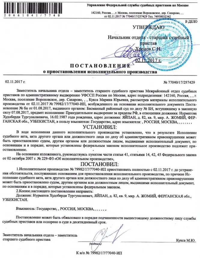 They sent us the paper signed by the Deputy Chief Bailiff of the Moscow Department of the Federal Service of Court Bailiffs M. Kuksa. She said: