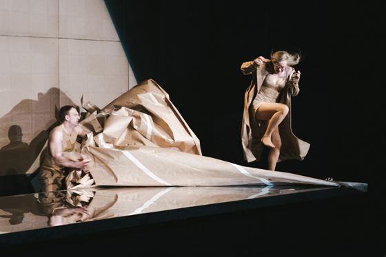 © Екатерина Краева На широкой площадке ЦИМа — затянутый крафтовой бумагой помост (Рыжаков впервые работает с выдающимся сценографом Николаем Симоновым), по центру которого замерли Андрей Бурковский и Юлия Пересильд в одолженной у Барбары Брыльской меховой шапке. Музыкальный сигнал — и начинается словесная баталия, в кульминационные моменты переходящая в рукоприкладство: ближе к финалу одетые от Bosco di Ciliegi герои «Солнечной линии» изобьют друг друга всеми возможными, как в ужастиках, способами, с карикатурным ломанием рук и смачными ударами в пах. Фоном для изматывающего, патетичного, смешного поединка, пересыпанного изящным матом, служит видео Владимира Гусева, изображающее то интерьер дома, то косой дождь, а в момент трогательного признания взрывающееся россыпью космоса.