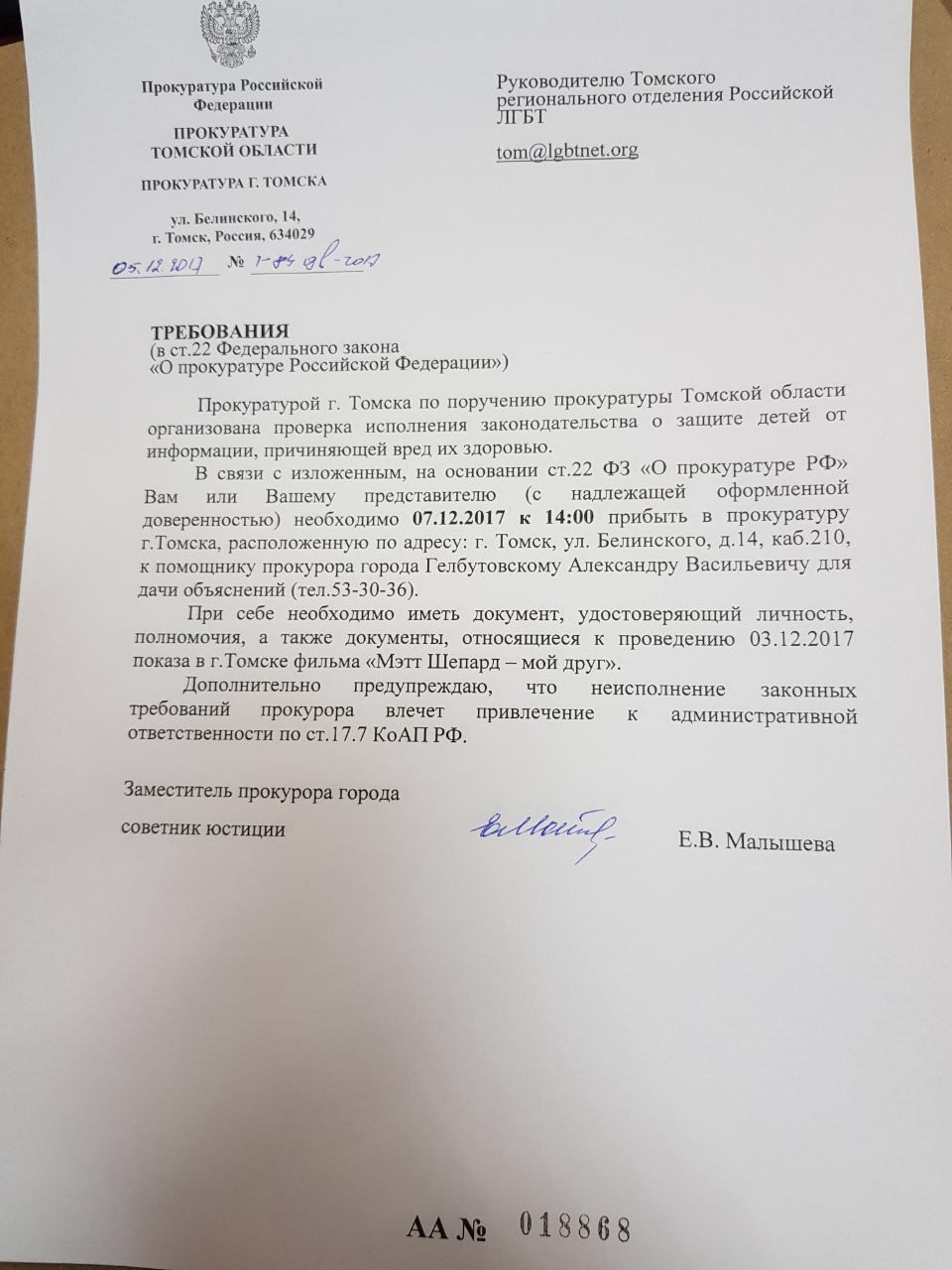 Томск: ЛГБТ-активиста вызвали в прокуратуру из-за фильма